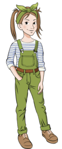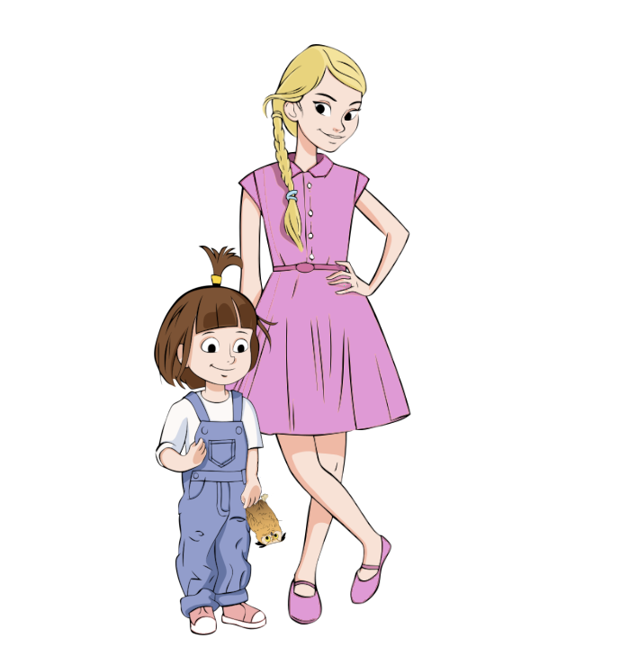 Jane la Dame ne rejette pas du tout ce surnom car elle est délicate et un peu précieuse. Attentive à ses toilettes, elle refuse de se salir. Si on l’écoutait, elle changerait de robe deux fois par jour comme pour aller au bal car elle adore danser ! Elle passe beaucoup de temps à tresser ses longs cheveux blond vénitien dont elle est très fière. Elle veut superviser tout ce qui se passe dans la maison. Cependant, à 7 ans, elle a bien du mal à s’imposer auprès de la bande des joyeux fous de la famille. Je sais qu’elle est en admiration devant moi. J’avoue que ça me plaît même si elle essaye de ne pas le montrer et que je fais semblant de ne pas m’en rendre compte. Quant à Alice, ma petite sœur de 3 ans, c’est une petite pomme qu’on a envie de croquer. Elle a hérité de la peau claire de papa et des fossettes de maman. Espiègle, avec son petit palmier brun au-dessus de la tête, Alice la Malice veut nous suivre partout avec son doudou Bouh le Hibou ! Elle essaye toujours d’amadouer Manon quand on part en expédition. Autant Jane s’inquiète de savoir si ce n’est pas dangereux de faire ci ou d’aller là, autant Alice n’a qu’un mot à la bouche : « Je veux y aller ! » ou encore « Moi aussi ! ». Moi, j’adore lui raconter des histoire pour s’endormir.