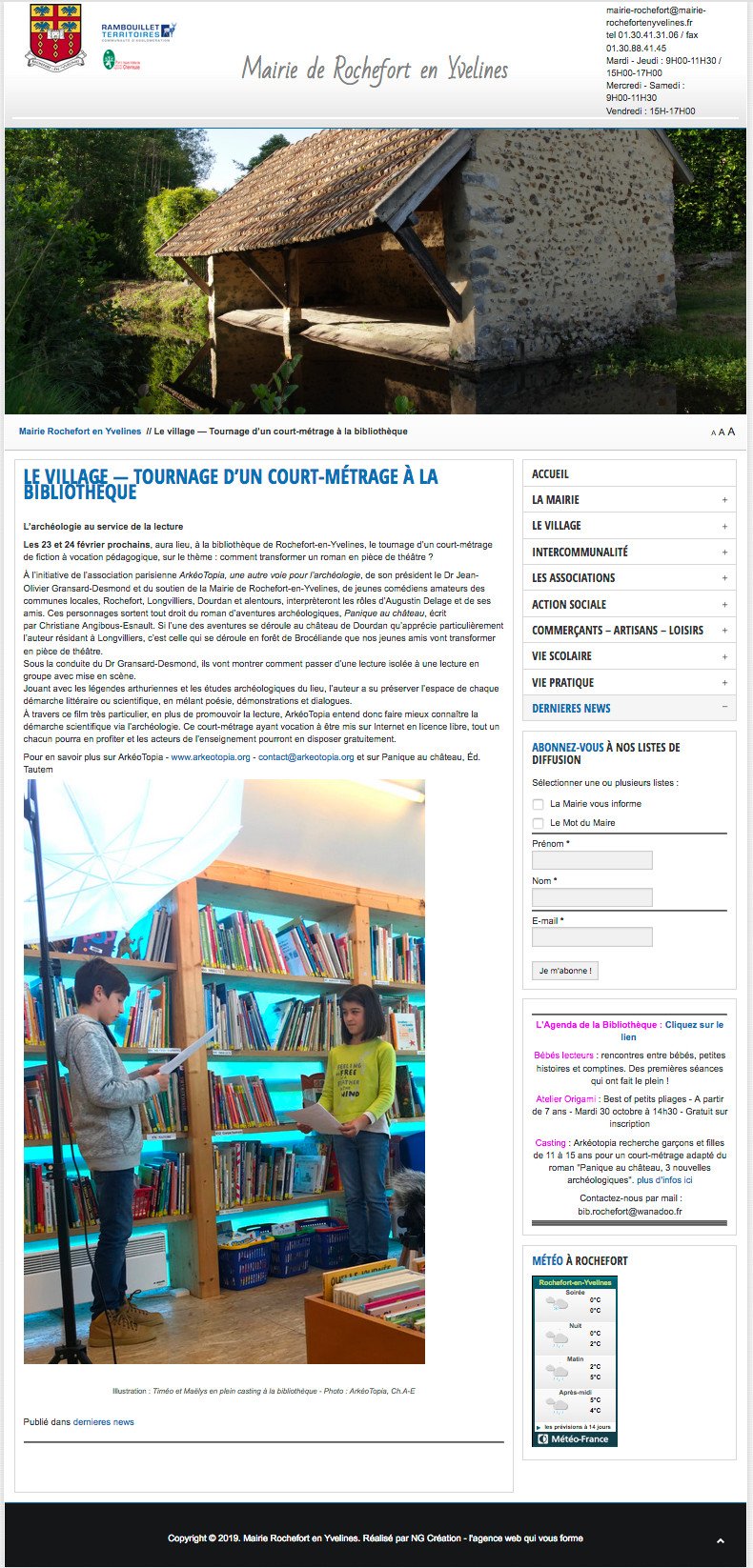 Annonçant le tournage à la bibliothèque du fictoriel Fées contre faits, de la lecture au théâtre adapté de mon roman Panique au château, Irène Ivancic écrivait : « À travers ce film très particulier, en plus de promouvoir la lecture, ArkéoTopia entend donc faire mieux connaître la démarche scientifique via l’archéologie. »