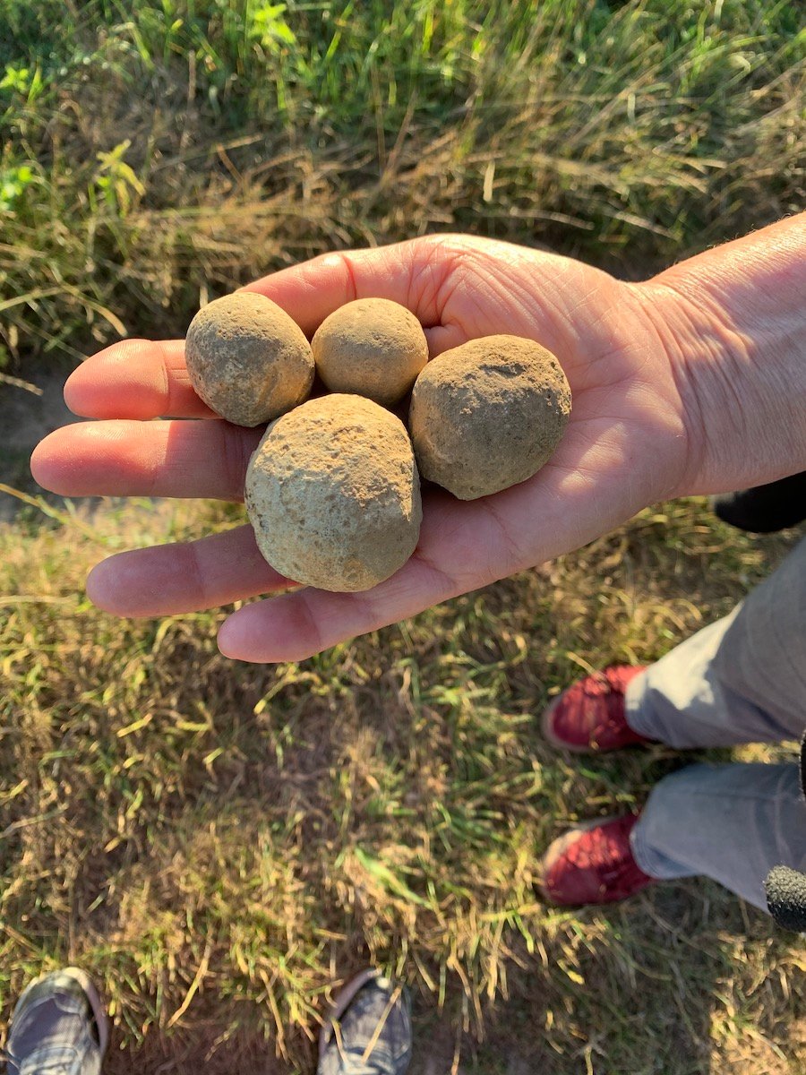 Trois petites pierres et l’imagination s’envole. Je sais que ce sont des géodes de calcaire. Mais elles sont si rondes, si régulières, si nombreuses qu’elles en deviennent mystérieuses. Ne pourrait-on imaginer que ce sont des balles de fronde d’un temps ancien remontées du sous-sol au moment des labours, ou des œufs de dinosaures fossilisés, ou bien des balles creuses imitant la pierre et contenant des messages secrets ? On m’opposera que ce sont peut-être des déjections d’animal disparu, ou les balles du Petit Poucet et les billes du Géant, ou les boules anti-stress de l’ogre des enfers, ou encore des grêlons solidifiés des temps « Pré-Histériques », ou plutôt les instruments de musique façon bolas de la compagnie des Lapins bleus.